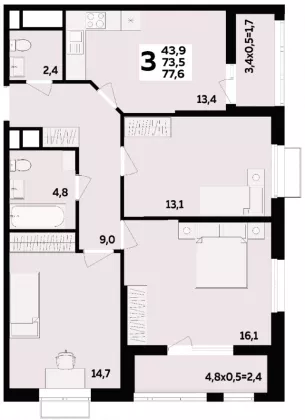 Продается 3-х комн. новостройка, 77.6 кв.м., 3/16 эт