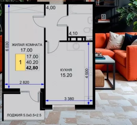 Продается однокомнатная новостройка, 42.8 кв.м., 3/7 эт