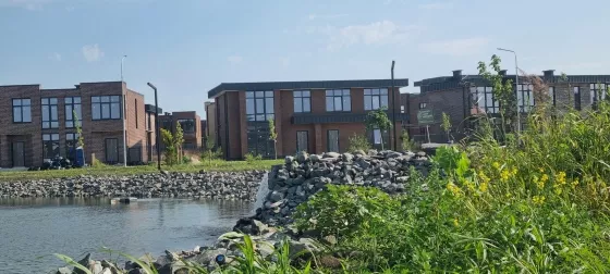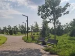 Сквер для прогулок с детскими площадками и зонами для спорта. Школа и детский сад уже принимают детей.