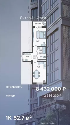 Продается однокомнатная квартира, 53 кв.м., 1/22 эт