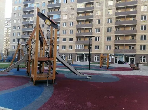 На первой линии ЖК высажен молодой яблоневый сад, красивая аллея с зонами отдыха. Много парковочных мест, двор вымощен плиткой, красочные безопасные детские площадки ограждены от проезжей части.