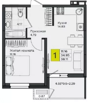 Продается однокомнатная новостройка, 38.11 кв.м., 7/8 эт