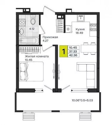 Продается однокомнатная новостройка, 42.36 кв.м., 5/8 эт