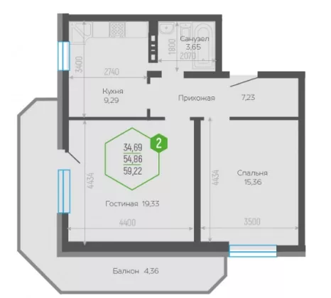 Продается 2-х комн. квартира, 59.22 кв.м., 7/19 эт