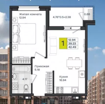 Продается однокомнатная новостройка, 43 кв.м., 5/8 эт