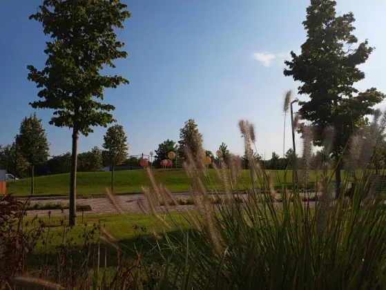 Большой парк: прогулочные аллеи и вело- дорожки, комфортные шезлонги, фонтан, амфитеатр для мероприятий, детский игровой городок, фудхолл и ресторанная галерея, зона для йоги, световые качели, скейтпарк, кинофестивальная площадка, зона воркаут и баскетбольное дерево, арт-объекты.