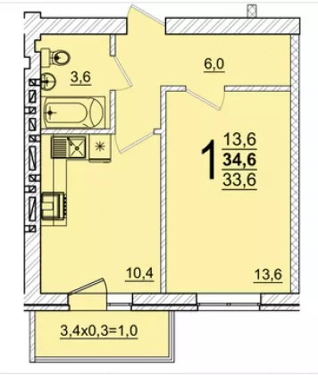 Продается 1-комнатная квартира площадью 34,6 кв.м с удобной планировкой — просторная жилая комната 13,6 кв.м и кухня 10,4 кв.м. Квартира находится на 3 этаже 5-этажного монолитного дома.