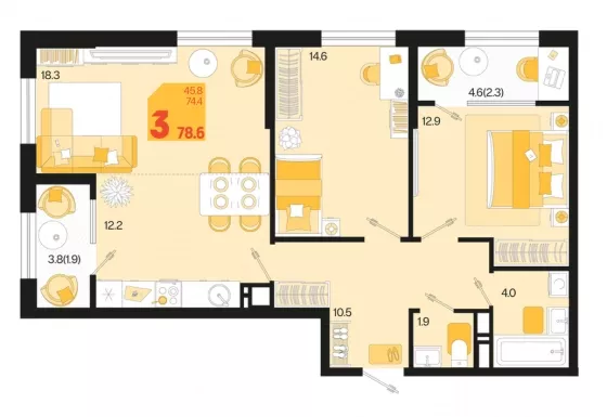 Продается 3-х комн. новостройка, 78.6 кв.м., 9/18 эт