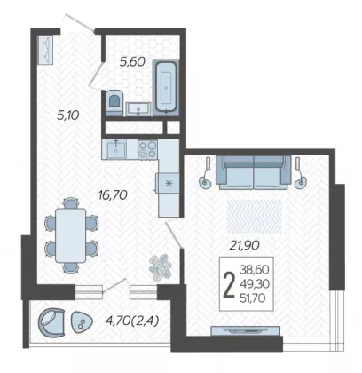 Продается 2-х комн. новостройка, 51.7 кв.м., 10/16 эт