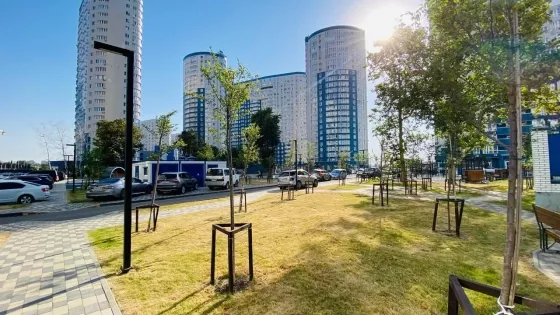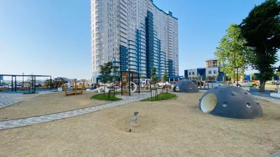- ЖК расположен в Центральном окpугe г. Краснодар на берегу p.Kубaнь.