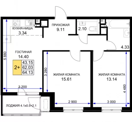 Продается 2-х комн. новостройка, 64.5 кв.м., 7/16 эт