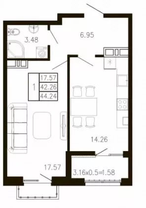 Продается однокомнатная новостройка, 44.24 кв.м., 8/9 эт