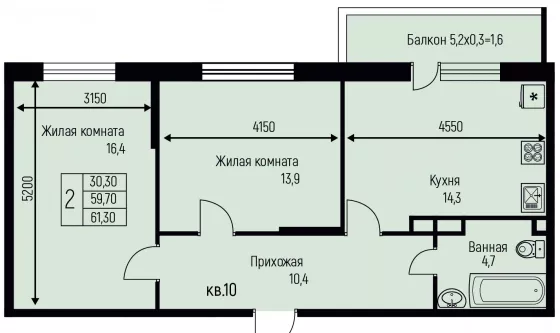 Продается 2-х комн. новостройка, 61.3 кв.м., 2/3 эт