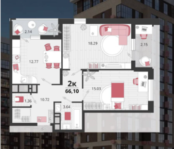Продается 2-х комн. новостройка, 66.1 кв.м., 7/18 эт