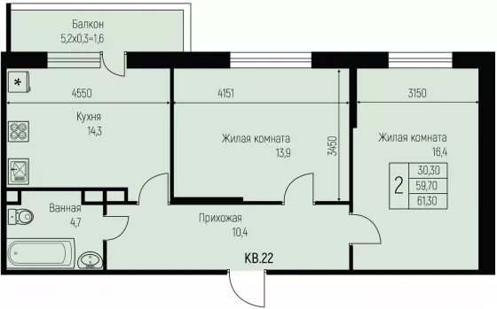Продаётся двухкомнатная квартира с большой кухней- гостиной 14,3 м2!