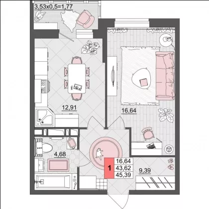 Продается однокомнатная новостройка, 46 кв.м., 4/16 эт