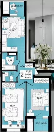 Продается 2-х комн. новостройка, 63.43 кв.м., 10/18 эт