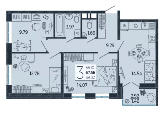 Продается 3-х комн. новостройка, 69.02 кв.м., 7/21 эт