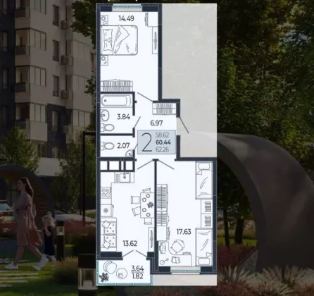 Продается 2-х комн. новостройка, 60.98 кв.м., 12/22 эт