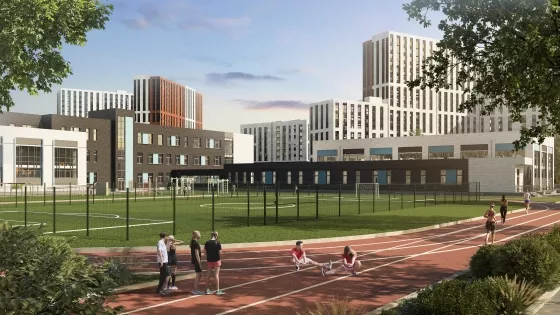 B проекте: две поликлиники: детская и взрослая на 500 посещений, 5 детских садов на 1 400 мест, ещё одна школа 1 700 мест с крытым 25-ти метровым бассейном.