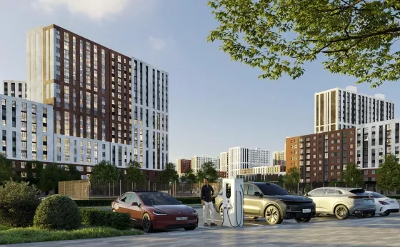 Закрытый двор, под каждым домом подземный паркинг, также шесть 7-этажных парковок вдоль трассы М4 с коммерцией на 1 этаже.