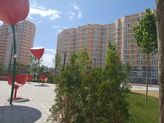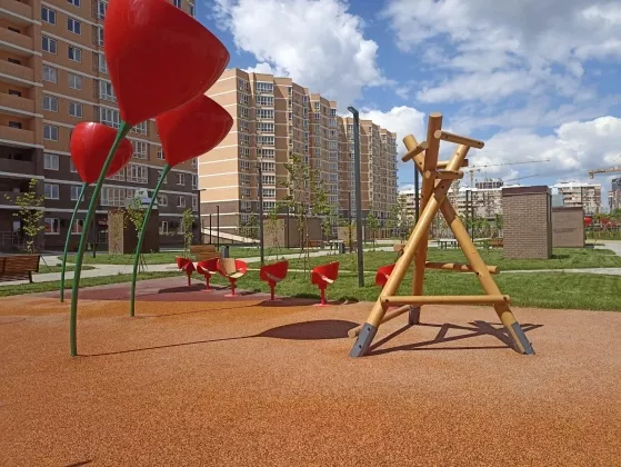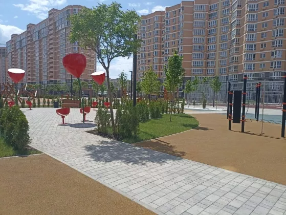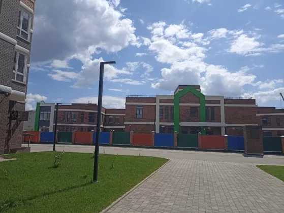 На территории детские и спортивные площадки, ландшафтное озеленение, детский сад на 250 мест.