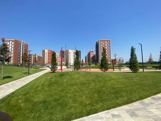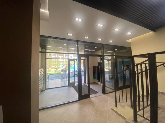 колясочная зона и помывочная для лап собачек .так же есть площадки для собак. продуманный ландшафтный красочные детские площадки и, много зелени и свежего воздуха.