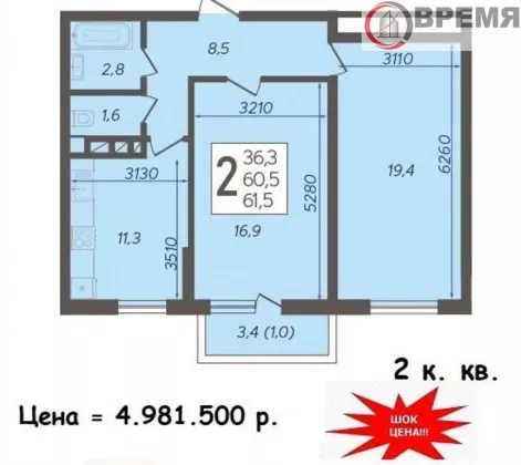 Горячее предложение!!! Акция "осенние каникулы». Двухкомнатная квартира, витражное остекление лоджии в пол!
