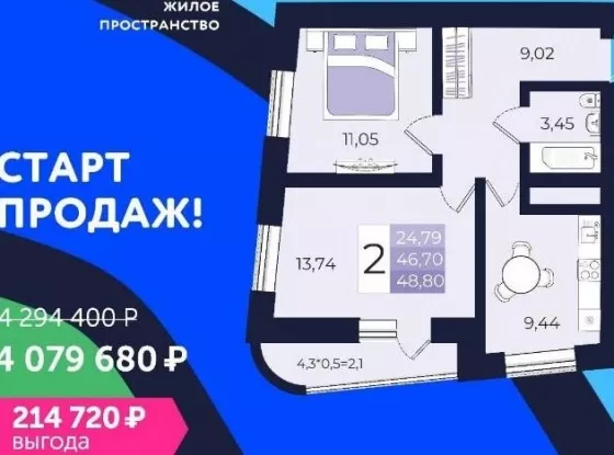 Двухкомнатная квартира на старте продаж по отличной цене!!!