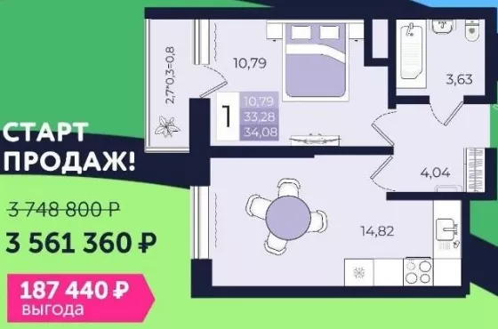 Однокомнатная квартира с большой кухней, на старте продаж по отличной цене!!!