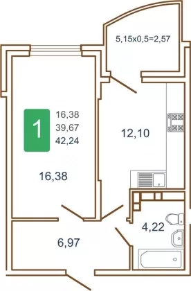 Продается однокомнатная квартира, 42.24 кв.м., 9/16 эт