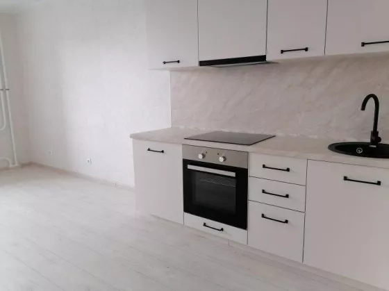 На кухне установлен кухонный гарнитур со всей необходимой техникой: варочная поверхность, духовой шкаф, вытяжка всё новое и добротное. Хороший смеситель и стильная раковина, на мебели дорогая фурнитура. Сан/узел - с сантехникой, балкон остеклен.