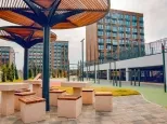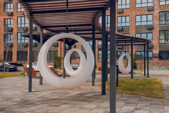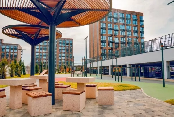 Уютные беседки, современные детские и спортивные площадки на стилобате, автоматические поливы газонов, аллеи для прогулок, широкие дворы.