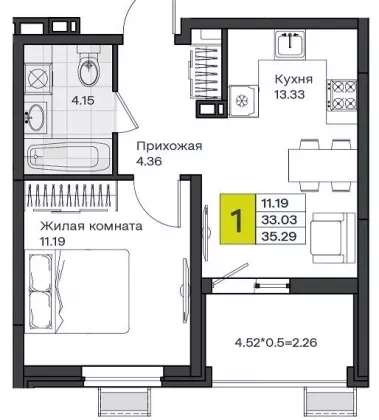 Продается однокомнатная новостройка, 35.29 кв.м., 4/8 эт