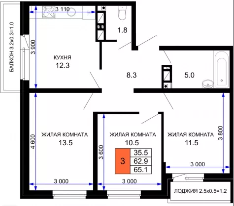 Продается 3-х комн. новостройка, 65.1 кв.м., 8/16 эт