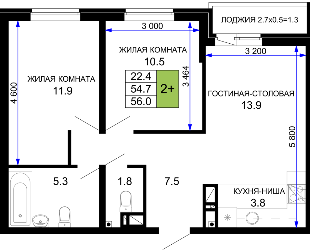 Продается 2-х комн. новостройка, 57.5 кв.м., 5/16 эт