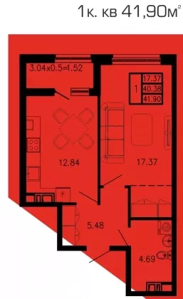 Продается однокомнатная новостройка, 41.9 кв.м., 1/9 эт