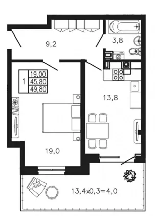 Продается однокомнатная новостройка, 49.8 кв.м., 1/4 эт