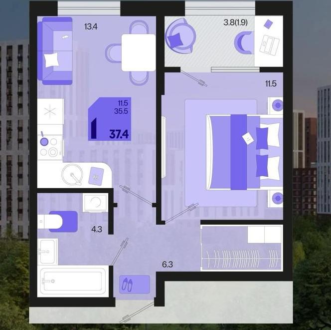 Продается однокомнатная новостройка, 37.4 кв.м., 2/18 эт