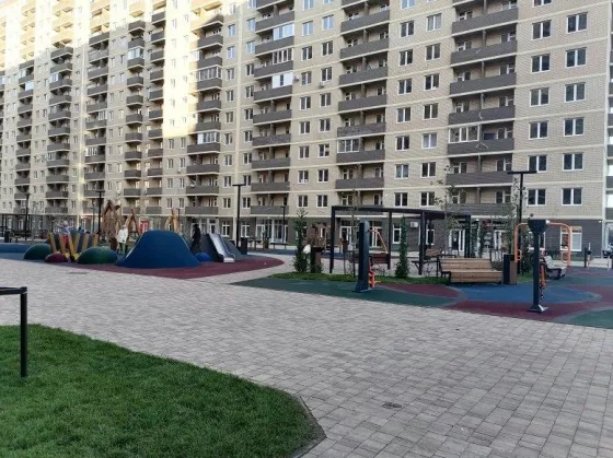 На первой линии ЖК высажен молодой яблоневый сад, красивая аллея с зонами отдыха. Много парковочных мест, двор вымощен плиткой, красочные безопасные детские площадки ограждены от проезжей части.