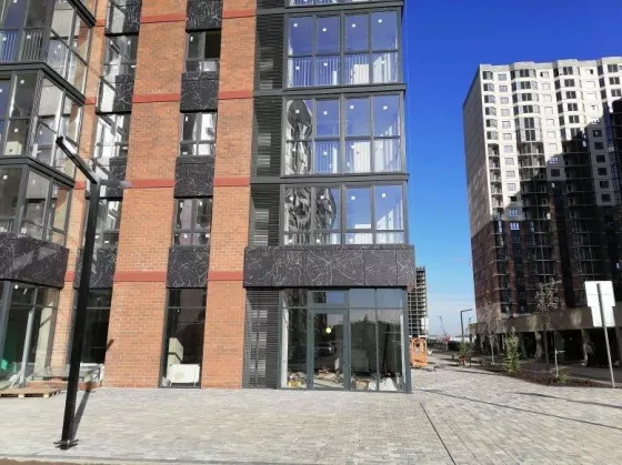 На первых этажах дома витражное остекление там коммерческие помещения разной направленности: магазины, студии фитнеса, салон красоты, аптеки, кафе много другое.