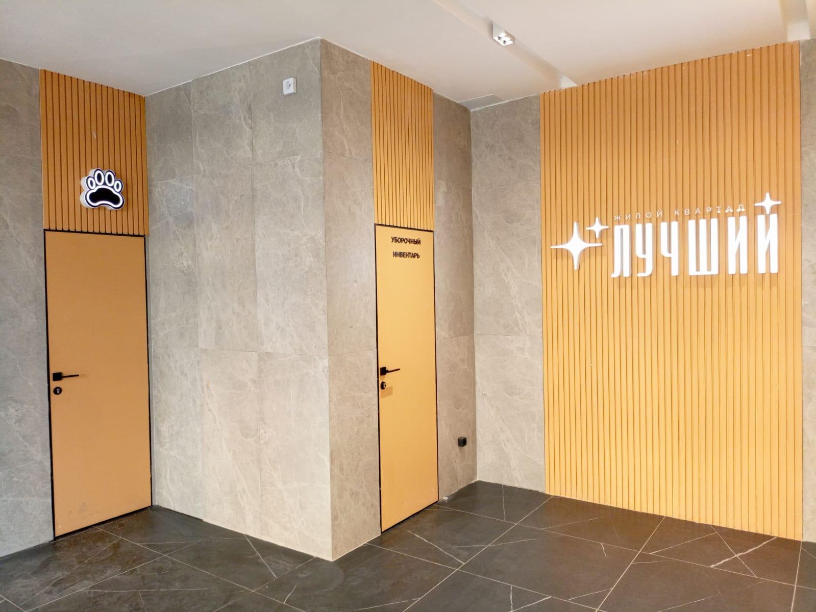 Тёплый уютный холл, мягкое освещение, приятные цвета. Интерьеры подъездов выполнены в едином стиле. В холле и на этажах сделана навигация, чтобы легко сориентироваться.