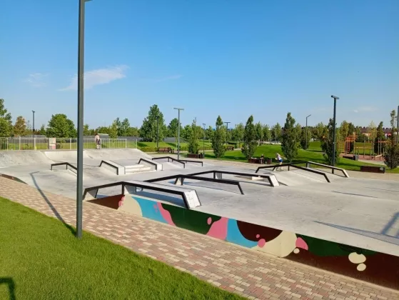 На территории комплекса можно прогуляться по аллеям с арт-объектами, насладиться музыкой поющих фонтанов, покачаться на световых качелях или перекусить в фуд-траке