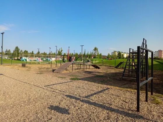 Большой парк: прогулочные аллеи и вело- дорожки, комфортные шезлонги, фонтан, амфитеатр для мероприятий, детский игровой городок, фудхолл и ресторанная галерея, зона для йоги, световые качели, скейтпарк, кинофестивальная площадка, зона воркаут и баскетбольное дерево, арт-объекты