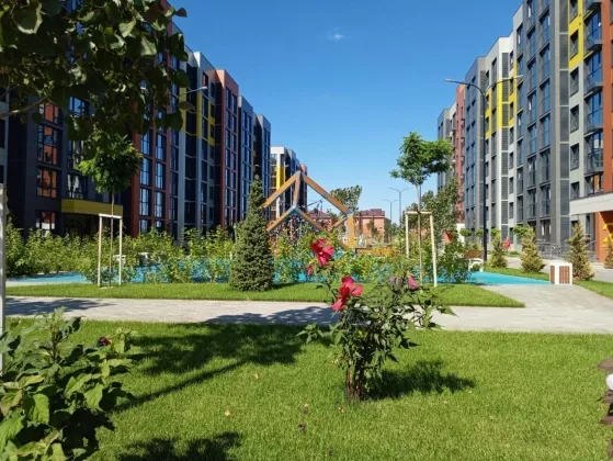 Благоустройство придомовой территории предусматривает качественное озеленение, места отдыха, зону спорта и игровые площадки для детей разных возрастов.