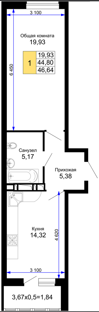 Продается однокомнатная новостройка, 46.64 кв.м., 12/15 эт