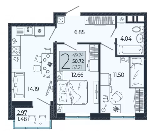 Продается 2-х комн. новостройка, 50.72 кв.м., 14/21 эт