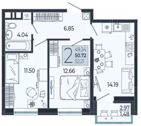 Продается 2-х комн. новостройка, 50.72 кв.м., 6/21 эт