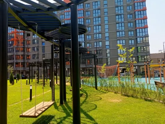 Придомовая территория с ландшафтным дизайном разделена на безопасные детские площадки с тренажерами, зонами воркаута с тренажерами и турниками, баскетбольная арт- площадка и местами для отдыха.