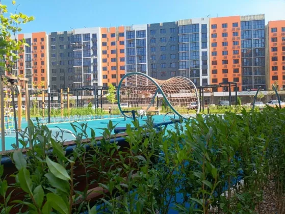 Придомовая территория с ландшафтным дизайном разделена местами для отдыха, безопасные детские площадки с тренажерами, зонами воркаута с тренажерами и турниками, баскетбольная арт- площадка.